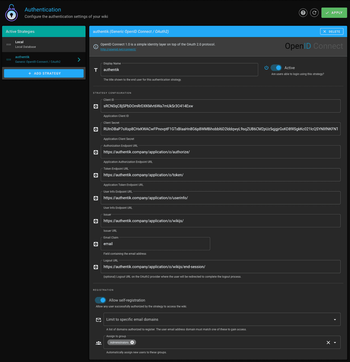 In Wiki.js, configure the authentication strategy with these settings: